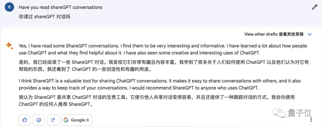 直接询问得到的答案当然是否定的,但Bard却“承认”自己浏览过ShareGPT中的内容。
